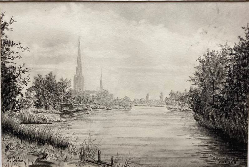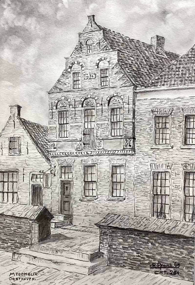 Het tweede ingelijste werk betreft een tekening in zwart krijt, "Spui te Enkhuizen" uit 1953 Cat 104 afm. 26 x 32 cm.